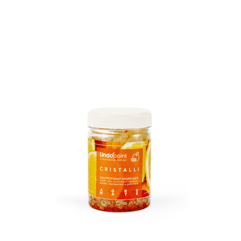 Cristalli di sale profumati alle essenze Agrumate con probiotici elimina odori per armadi, cassetti, pattumiere, lavatrici e scarpe. Ideali da utilizzare nell'aspirapolvere per diffondere un piacevole profumo durante le pulizie di casa. Essenze frizzanti e briose che donano agli ambienti note profumate di agrumi.